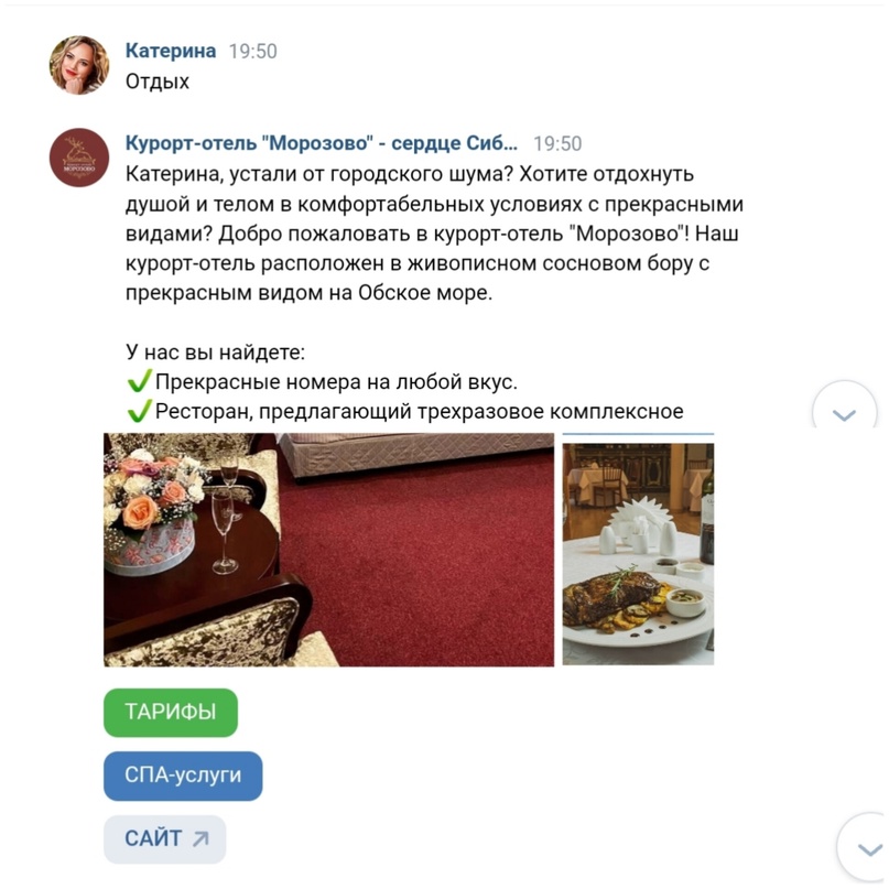Также для удобства гостей был настроен чат-бот, который по кодовому слову «Отдых» активировал автоматическую отправку прайса, фото номеров и ссылку на сайт. Этой фнукцией люди с удовольсвием пользуются.