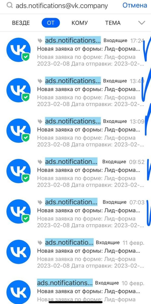 Заявки сейчас приходят на почту. В заявке видно ответы и метка рекламного объявления, с которого пришел лид.